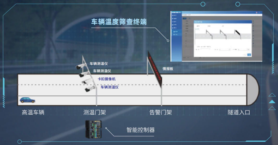 隧道外高温车辆筛查,提前预防燃爆事故车辆温度筛查管控系统由车辆温度筛查管控终端、高清卡口摄像机、空间车辆测温仪、情报板、扬声器和边缘智能控制器组成,在隧道洞外探测行驶中车辆的温度、车牌、热感合成图片、视频等数据,及时在隧道外情报板上发布高温预警信息,提前预警燃爆事故,有效减免恶性事件的发生。