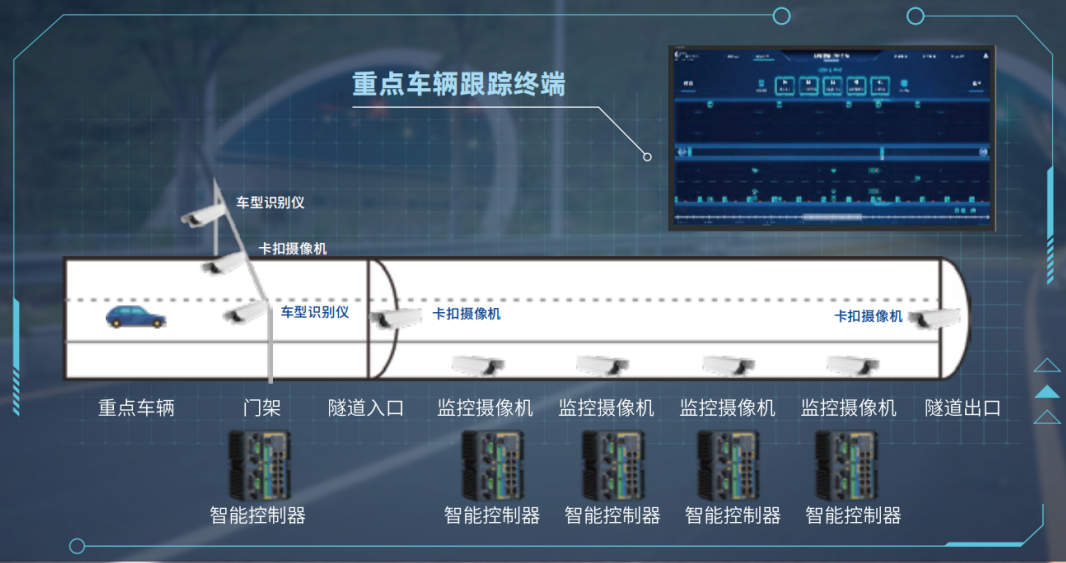 “两客一危”、重型货车等重点车辆轨迹跟踪重点车辆跟踪系统由重点车辆跟踪终端、高清卡口摄像机、车型识别仪、隧道内监控摄像机和智能控制器组成。在隧道入口前识别车辆的车牌、车型、轴数、轴距、车长信息,在隧道内对“两客一危”、重型货车等重点车辆进行全程视频跟踪,监测车辆的异常事件并及时告警。