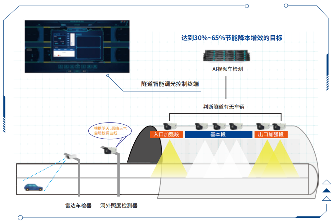 “四元”控制模型,绿色节能降本智慧照明控制系统由智慧照明调光终端、雷达车检器、洞外照度检测器、AI视频车检器、智能照明集控器组成。采用物联网、AI视频分析、边缘计算、国产化等技术,并根据隧道交通量、洞外光强、洞内光照及时序等数据的采集与分析,构建高速隧道“车入灯亮、车出灯暗”洞口加强照明控制和“车来灯亮、车走灯暗”全洞跑马灯试节能智慧照明控制系统。实现在单条隧道或多条隧道安全照明前提下,达到节能降本增效的要求。