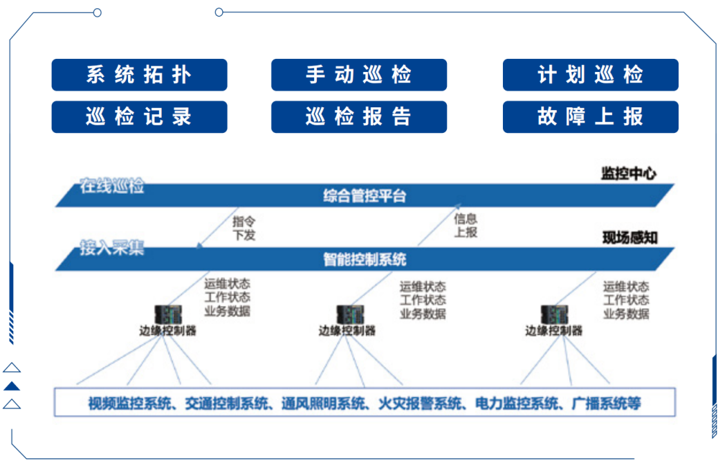 隧道智能控制系统由中心智能控制柜、边缘智能控制器和智能控制终端组成,整合接入各类机电设备/子系统,如火灾报警系统、电力监控系统、紧急电话广播系统、本地控制系统等,向上提供统一的符合技术规范的接口给其他第三方系统对接,具备设备全面接入、AI交通事件检测、智能预案联动等功能,实现对全部隧道运行情况的日常监测、对突发事件处置过程的跟踪和监管、对重大事件的决策和指挥。